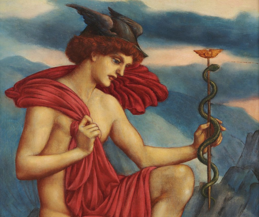 Por esto es representado, por una parte, con el sombrero de ala ancha de fieltro y el caduceo. Bueno, el caduceo es un regalo que le hace Apolo para tratar de aplacar la furia del dios cuando se le antoja robar 50 vacas del dios del Sol porque es un niño caprichoso y digno hijo de su padre… total, que Apolo se convierte en su BBF.