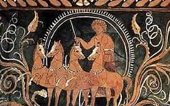 La representación más común de Helios es como un auriga que conduce su carro (tirado por cuatro caballos) a través del cielo cada día desde oriente a occidente y su cabeza está rodeada por un nimbo y por rayos de luz.