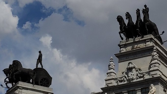 Hay en Madrid unas esculturas de un carro tirado por cuatro caballos, pero no sé lo suficiente de la ciudad para saber si se trata de Helios ya que la representación masculina no tiene el nimbo con los rayos de luz o sí, pero la miopía hace estragos.
