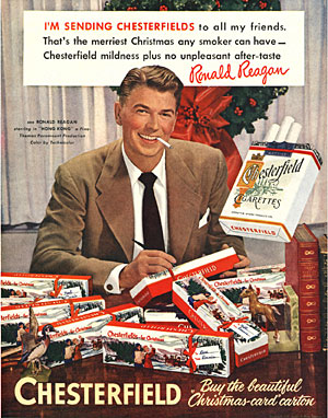 El tabaco se promocionaba en todas partes y era socialmente aceptado. Carteles de estrellas del cine anunciando tabaco, médicos, amas de casa, etc, todo esto ahora es impensable con las normativas sanitarias mundiales. El mismísimo Ronald Regan, actor de profesión y que luego se convertiría en presidente de EE.UU (eso sólo pasa en el país más libre del mundo, nótese ironía) promocionaba fumar tranquilamente con una buena sonrisa.