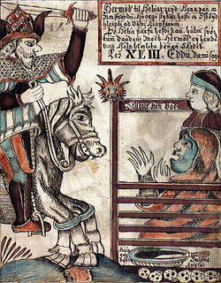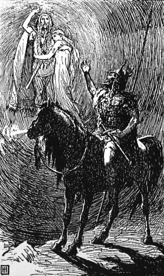 El mito sobre el que vamos a hablar es, probablemente, de los más conocidos del dios y cuentan los bardos que Odín se encontraba turbado por terribles presentimientos y sombríos temores sobre el futuro. Al principio, buscó en las Nornas las respuestas, pero nada obtuvo de ellas. Perdiendo hasta el sueño decidió ordenar a Hermod que vistiera en su armadura, tomara a Sleipnir y partiera rumbo a la tierra de los fineses donde vivía el más célebre de los hechiceros, su nombre era Rossthiof. No se trataba de un personaje loable, sin embargo, pues atraía a los viajeros a su reino haciendo uso de su magia para robarles y matarles. Por desgracia, también tenía el poder de predecir el futuro y eso era lo que interesaba a Odín por lo que, además de Sleipnir, Hermod también llevaba su vara llena de runas que le permitió sortear todos los engaños del hechicero y atarlo de pies y manos para obtener de él la información que precisaba.
