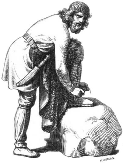 (Víðarr stabbing Fenrir while holding his jaws apart – W. G. Collingwood).