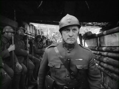 Senderos de gloria (Paths of glory) (1957, Stanley Kubrick), un travelling tras un oficial (Kirk Douglas) que avanza y pasa revista a sus soldados antes del ataque.
