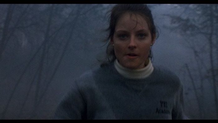 La lucha de Clarice no es solo contra un asesino, la típica dinámica de policía contra delincuente. Es un enfrentamiento físico e intelectual. Por otro lado la lucha de Clarice es mucho más interesante porque es contra todos y contra un mundo del que parece partir en desventaja. con el resto de compañeros hombres. Por eso la importancia de los primeros 10 minutos de metraje cuando vemos el entrenamiento del personaje interpretado por Jodie Foster corriendo por el bosque.