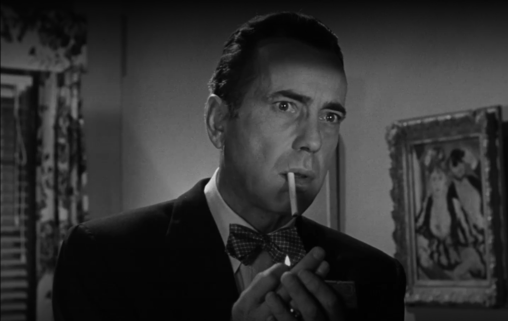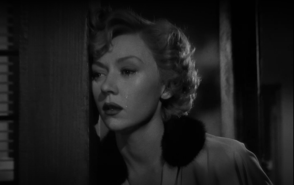 Guffey ilumina los rostros con precisión quirúrgica, consciente de que en esta película las miradas dirán más que cualquier línea de diálogo. A Bogart lo esculpe con luz dura y contraluces que afilan los pómulos y recortan la mandíbula, atrapando los ojos en un halo luminoso rodeado de sombra en los momentos en que parece perder el control. Así, mantiene intacto su carisma, pero subraya la amenaza latente. Su mirada en el retrovisor, imagen inicial de la película, es ya una declaración: es el reflejo de un interior oculto, y cuando ese interior parece aflorar, la luz lo inunda. Cuando recrea con morbosa fascinación el asesinato de Mildred, sus ojos brillan mientras el resto del rostro se sumerge en sombra. Dixon afirma haber matado a decenas “en la pantalla”, y el entusiasmo con que describe la violencia sugiere que la ficción ha penetrado en su imaginario hasta difuminar los límites; bajo las circunstancias adecuadas, podría convertirse en realidad. A Gloria Grahame, en cambio, la suaviza con difusión y grises medios más tiernos, en ella reside la posibilidad de salvación para Dixon. Pero cuando la tensión aumenta, la luz que la envuelve se endurece y se vuelve más penetrante, como si el clima emocional contaminara hasta su propia imagen.