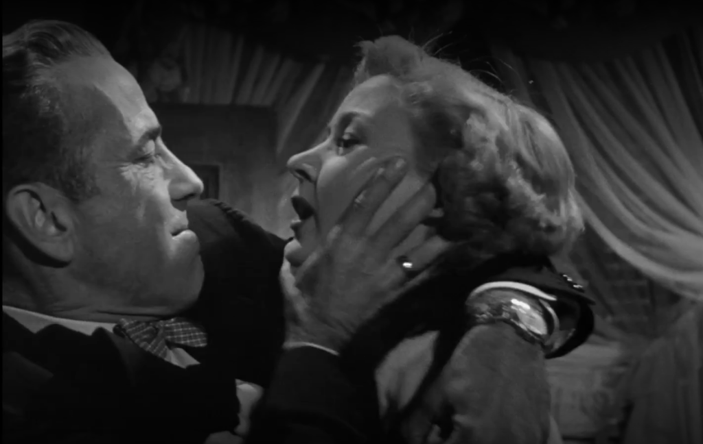 La relación se vuelve asfixiante. Dixon, que teme profundamente el abandono, intenta desesperadamente restablecer el control. Le propone matrimonio para retenerla, intercepta sus llamadas y no se separa de ella. Laurel empieza a planear su marcha en secreto, pero incluso en su huida siente la necesidad de proteger sus emociones: le deja todo el guion mecanografiado, como si amortiguarle el golpe fuera más importante que su propia seguridad. Es la prueba de hasta qué punto vive atrapada; incluso en peligro, el bienestar emocional del agresor sigue siendo prioridad, como si tuviera una obligación moral de dejarlo todo atado antes de poder liberarse. El contexto refuerza esta idea. Mel, más preocupado por Dixon que por ella, le aconseja que no lo deje así, que espere “a que le pase algo bueno” y que lo acepte tal cual es. Porque Dixon, además de ser un hombre violento, muestra una inmadurez emocional casi infantil: sus ataques de ira se asemejan a rabietas, se abalanza sin pensar, lanza objetos, cambia de expresión bruscamente ante la frustración. Bogart refleja con maestría a ese hombre incapaz de tolerar el rechazo, atrapado entre el miedo y la furia, reaccionando como un niño asustado. Su representante parece convencido de que debe protegerlo como a tal, tratando sus ánimos con cuidado. Pero esa disonancia entre sus comportamientos y la madurez que se espera de un hombre adulto es, al mismo tiempo, profundamente chocante y peligrosa.