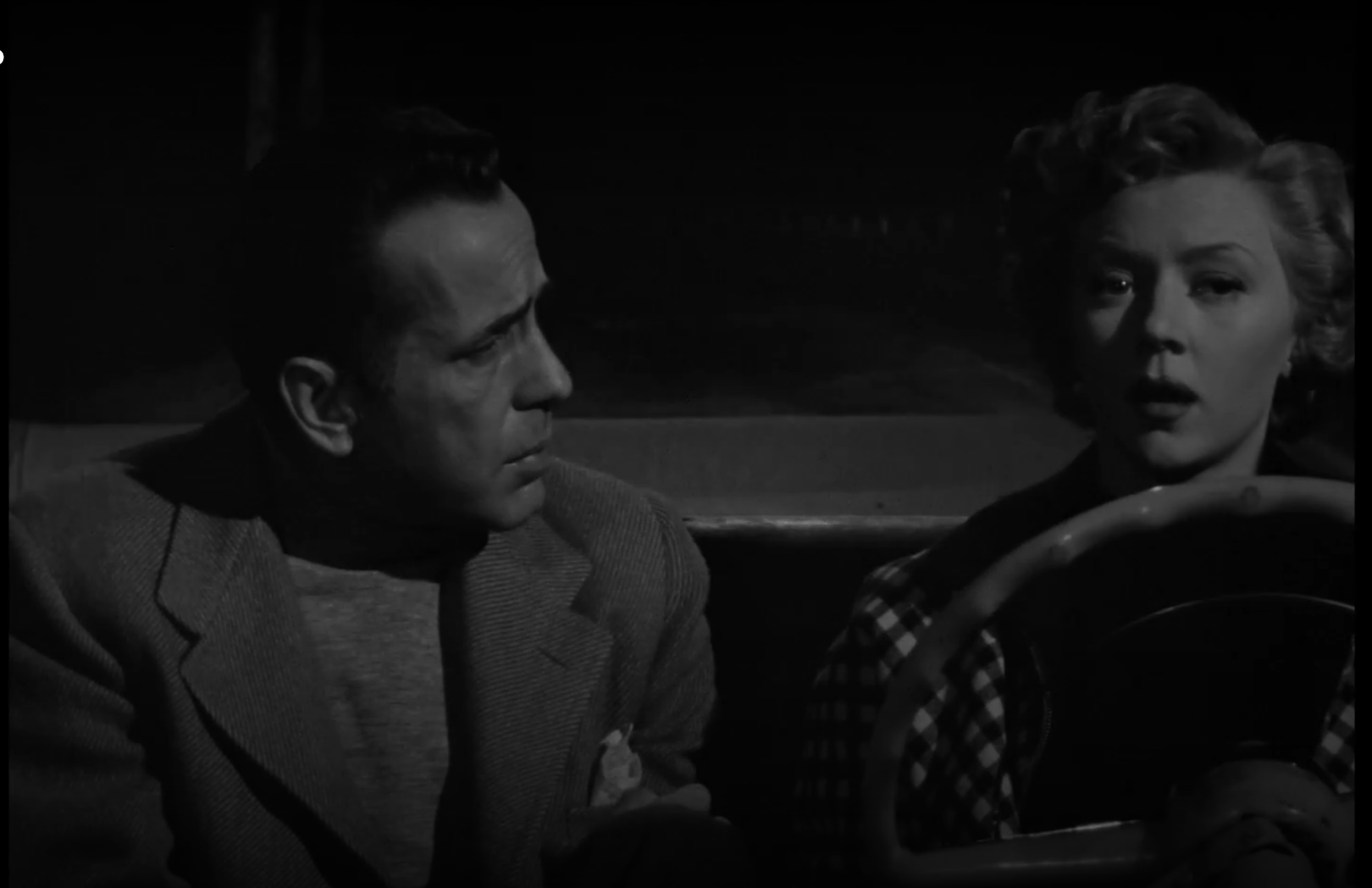 Los espacios que recorre la película no son simples decorados, sino proyecciones de la geografía interior de sus personajes. El apartamento de Dixon, en el mismo complejo que el de Laurel, está situado debajo del de ella. Laurel puede verlo a él, pero él no puede verla a ella; desde el inicio, él está “por debajo” en términos de control emocional y de perspectiva. Sin embargo, a medida que Laurel pasa más tiempo en ese lugar inferior, va adentrándose en un territorio más oscuro, cerrado y antes oculto. El propio apartamento de Dixon tiene su frontera simbólica: el paso entre la entrada y el salón, es donde los personajes se detendrán más de una vez a conversar o a observarlo, como si cruzar ese límite físico equivaliera a internarse en capas más profundas y menos evidentes de su personalidad. No es casual que, en ese mismo umbral, cuando aún apenas lo conoce, Laurel afirme que cree en su inocencia. Igual que en Hollywood, también aquí hay que ganarse el derecho de entrada al interior de un hombre inaccesible como Dixon. Muchas de las conversaciones cruciales ocurren en estos espacios liminales, en umbrales donde los estados de ánimo cambian o en coches en movimiento donde, por ejemplo, el personaje de Bogart percibirá por primera vez lo cerca que parece estar el abandono de Laurel. Lugares de tránsito en los que cada palabra podría inclinar la historia hacia un rumbo distinto.
